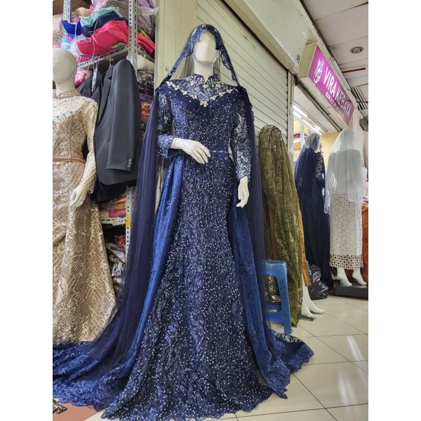 Wedding dress/gaun pernikahan renda dengan payet warna biru nevy.